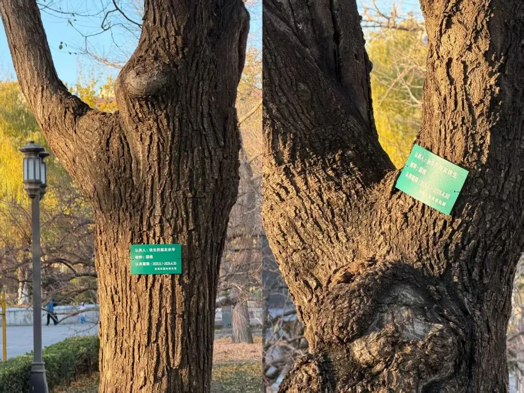顺着树林从南往北走,一路上就能看到每棵树上都挂着绿色的名牌,它们是地坛公园的第二个出圈景观——“养树牌”。