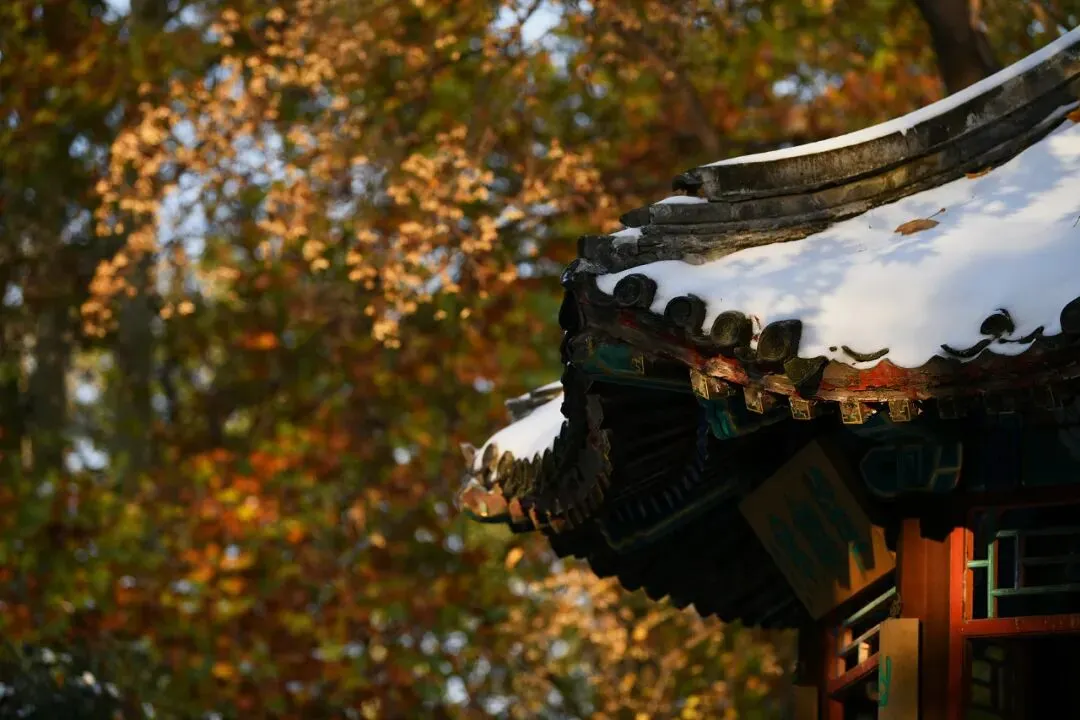 △地坛枫叶与檐上落雪。(图/视觉中国)