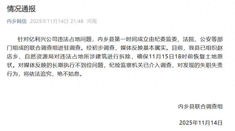 11月14日晚,河南省南阳市内乡县联合调查组情况通报:针对亿利兴公司违法占地问题,内乡县第一时间成立由纪委监委、法院、公安等部门组成的联合调查组进驻调查。经初步调查,媒体反映基本属实。目前股票配资公司行业门户,我县已组织赵店乡、自然资源局对违法占地所涉建筑进行拆除股票配资公司行业门户,确保11月15日18时前恢复土地原状。对媒体反映的长期执行不到位问题,纪检监察机关已介入调查,对发现的失职失责行为,将依法追究,绝不姑息。