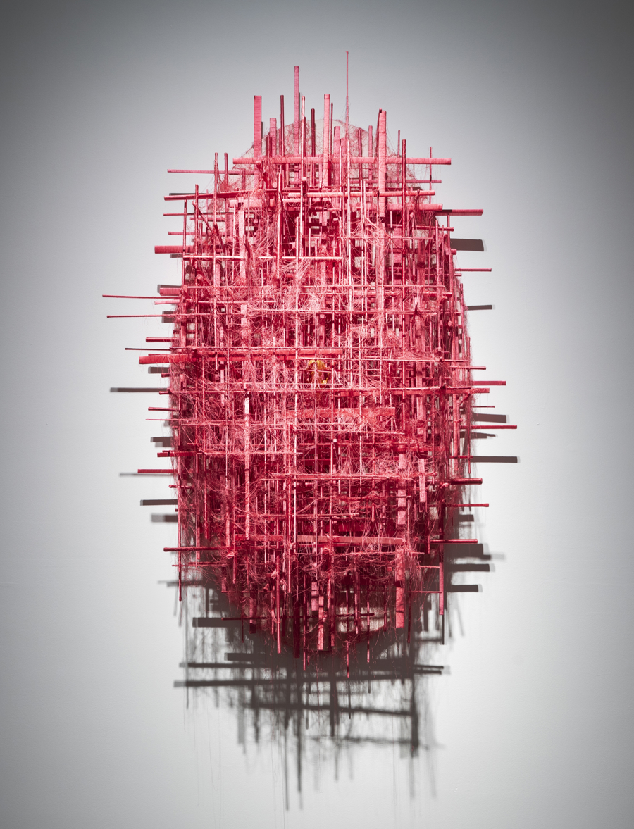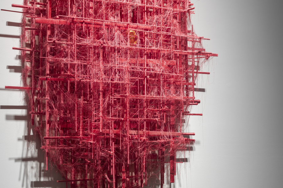 在职业生涯早期,林天苗便开始使用各种柔性材料,用缠绕与缝合的方式编织出属于女性的个体经验与集体记忆。《辫》(1998年)是她以无数根线勾勒出的巨型自画像,丝线模糊了具象特征,仅存人类共有的基本生理表象。用棉线缠绕标志性日常物品的《缠了,再剪开》(1997年)是她惯用的创作语言,也是她作为女儿的童年记忆,以及身为母亲所处境遇的双重人生体验。《i-情》(2024-2025年)和《一滴一点》(2021-2022年)创作于与二次癌症抗争期间,体现借助艺术来抵抗病痛时,身体与情绪面临的双重挑战。