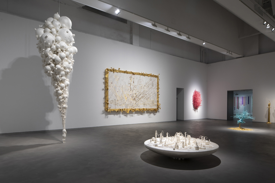展览标题“没什么好玩的!”取自林天苗1997年的同名作品。当时她用棉线缠绕出一个直径2.5米的巨大球体,并在绣花绷上绣下这句戏谑的自白,表达她对创作与生活的独特理解。“‘没什么好玩的’不仅是展览名称,也代表了艺术家的创作态度。林天苗从最基础的手工制作出发,将触摸的感受转化为视觉语言,突破各种限制。在新作中,我们更看到她运用科技手段,在奇幻与荒诞中实现新的艺术突破。”上海当代艺术博物馆馆长龚彦说。