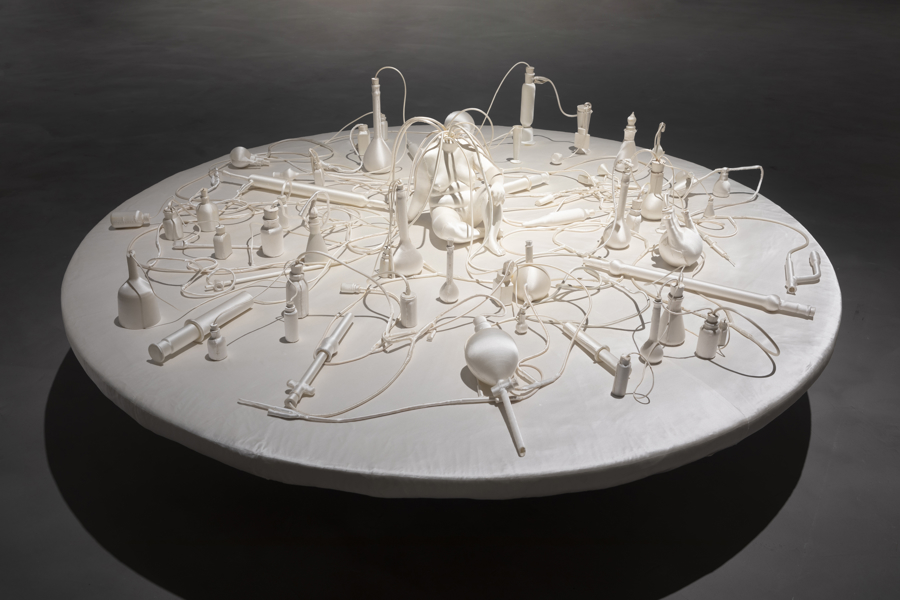 展览从两个主线展开。一部分作品关注“身体”,展现艺术家对自我认知、家庭角色、性别身份以及生命过程的思考。另一部分作品则以“日常物品”为主题,通过对日常用品的重新组合与改造,赋予它们新的情感和意义,让普通物品成为记忆与情感的载体。值得一提的是,本次展览呈现的新作《小人国》中,艺术家在一个350平方米的空间中,设置近百个类似人体形态的机械装置。这些机械不断移动并相互触碰,现场摄像机实时记录它们的动作并投射到四周平面上,形成一个充满想象力的动态场景。