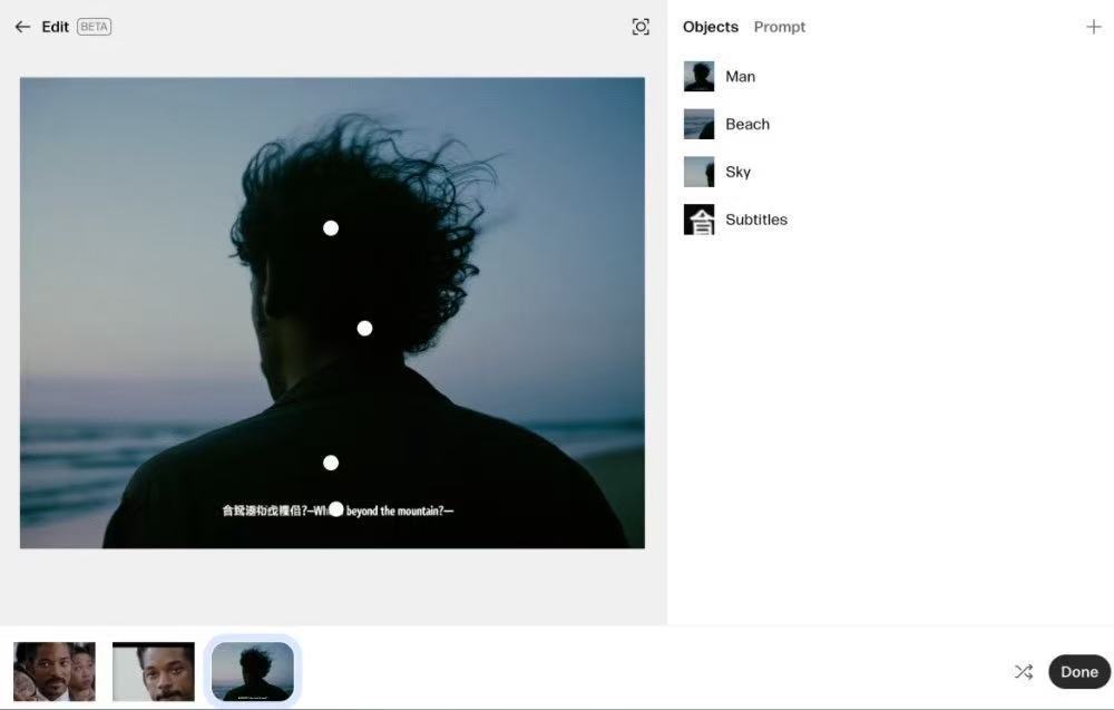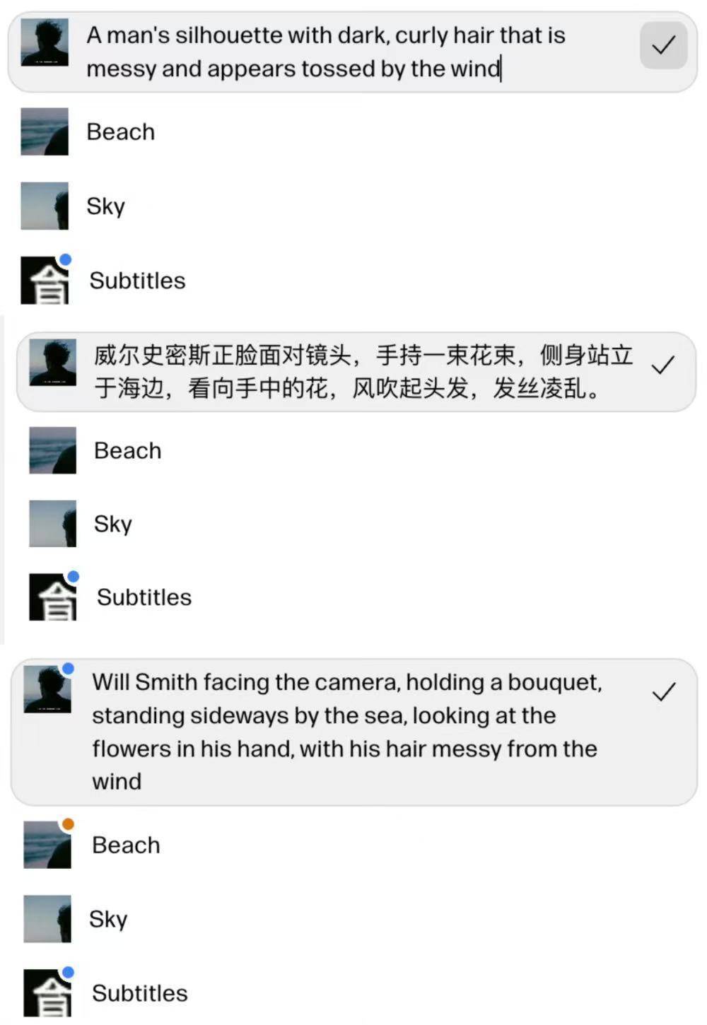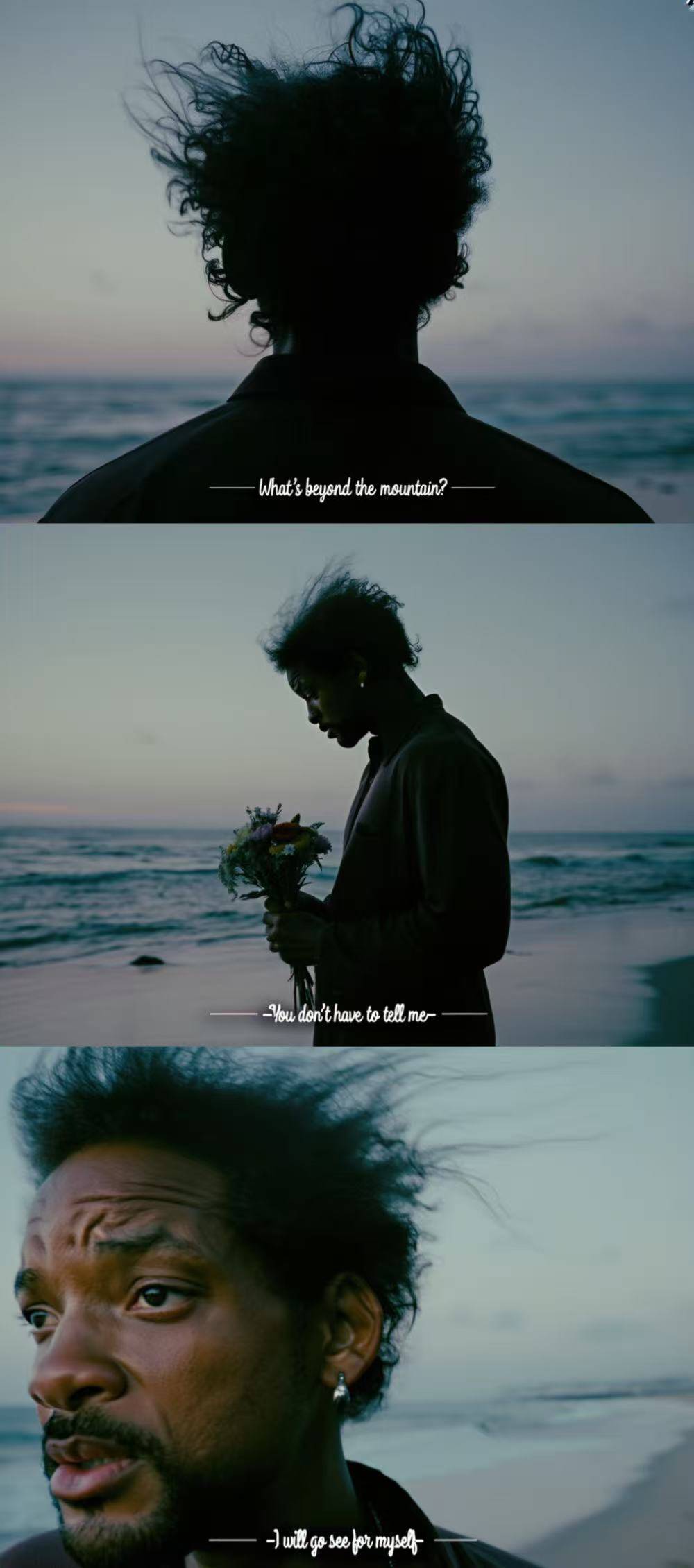 我们选择了“Start with text”,写了一段比较长的提示词,想生成三张海边傍晚的图,主角是威尔·史密斯,保持《当幸福来敲门》中的形象不变,分别是背影、中景、特写三张构图,每张图还配上中英文字幕。