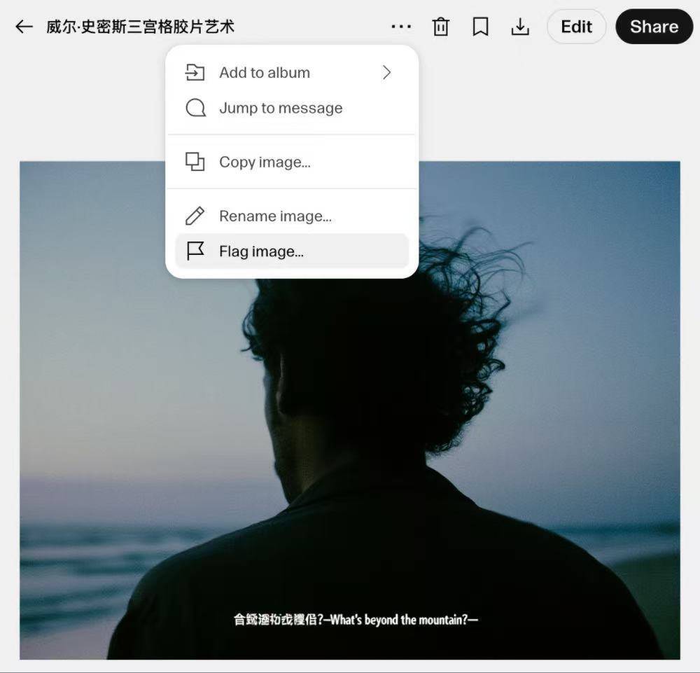 所以我们转向编辑这张图,看看能不能改动一下。图片上方的功能栏很丰富,可以收藏、下载、删除、改名,也有“编辑”按钮。