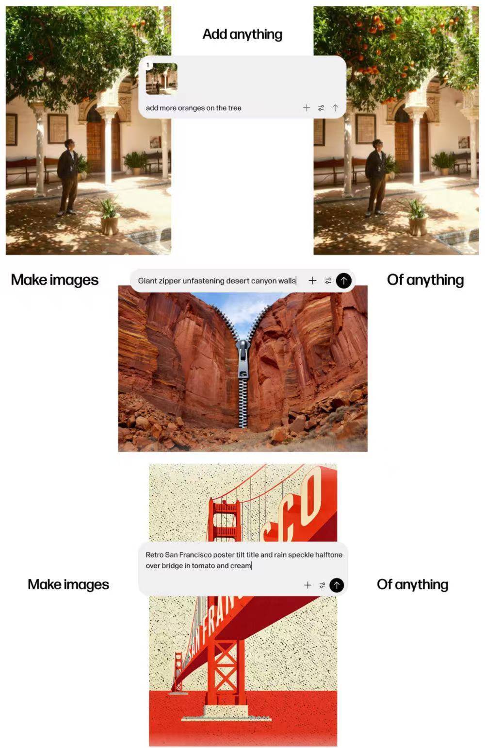 往下滑还能看到一些特别有意思的示例:比如让树上长满苹果、把玻璃反光直接擦掉、或者在沙漠的岩壁上拉出一条拉链,都可以作为创作灵感。