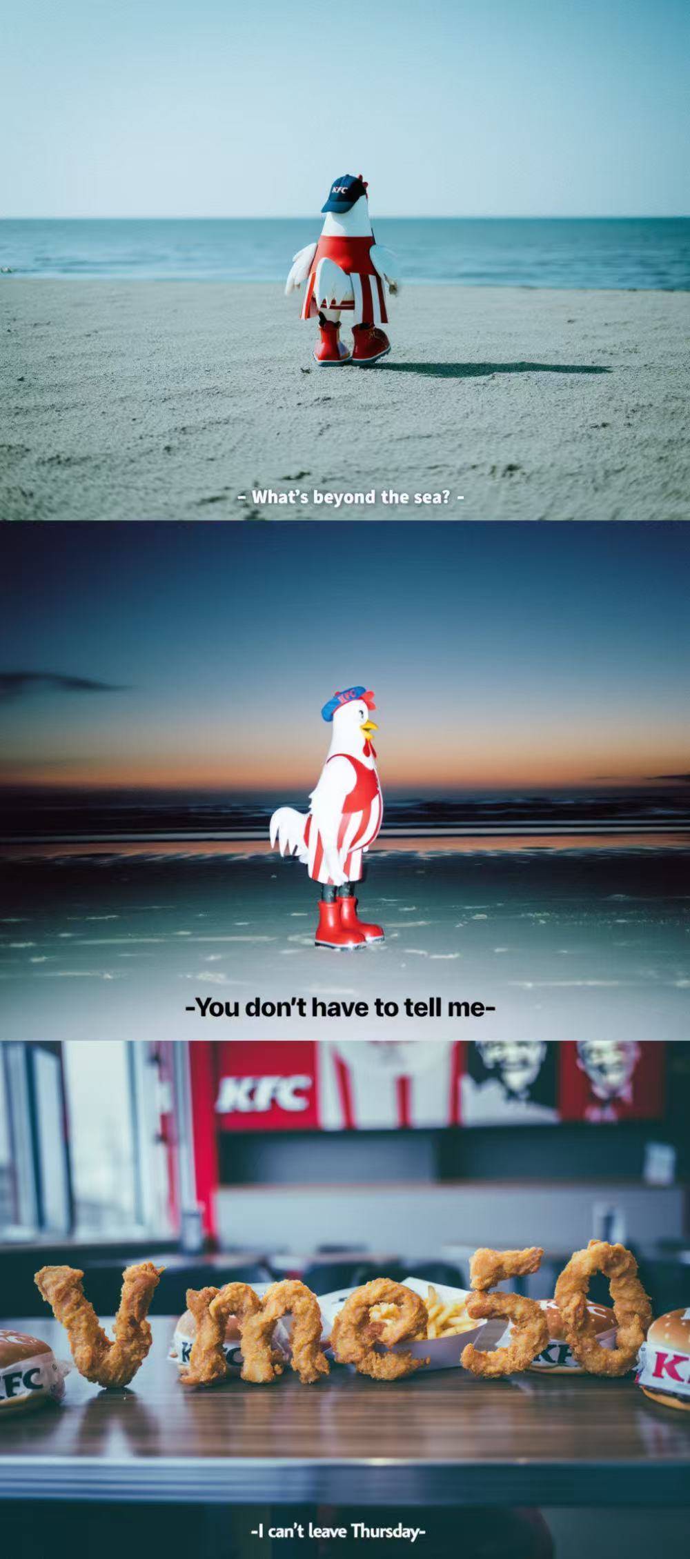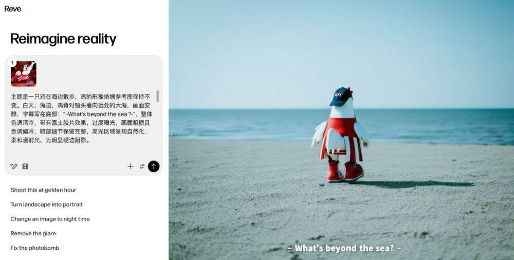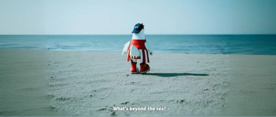 我们上传了一张肯德基吉祥物“奇奇”的照片,提示词写的是:主题是一只鸡在海边散步,鸡的形象依据参考图保持不变。白天,海边,鸡背对镜头看向远处的大海,画面安静,字幕写在底部:“-What’s beyond the sea?-”。整体色调清冷,带有富士胶片效果,过度曝光,画面粗粝且色调偏冷,暗部细节保留完整,高光区域呈现自然化、柔和漫射光,无明显硬边阴影。