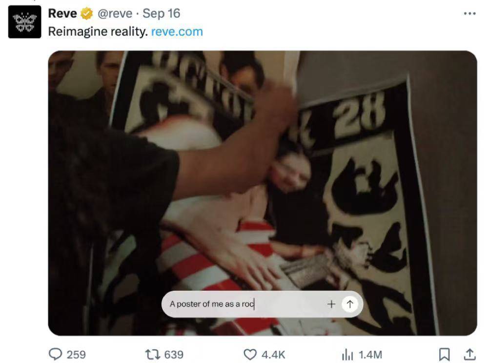 智东西11月4日报道,近日,一款在外网刷屏的AI图像工具Reve正加紧迭代,吸引了一大批用户,其以“Reimagine reality.(再造现实想象)”为标语的宣传片也已获得百万播放量。