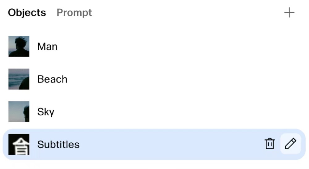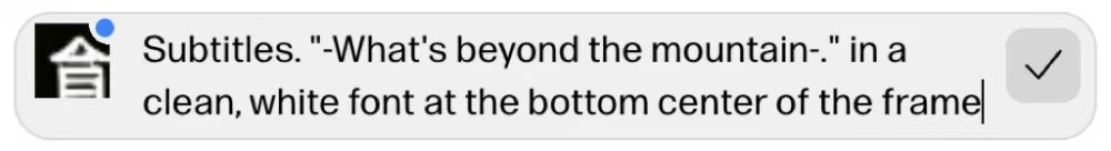 点击“字幕”这个图层,会弹出“编辑”和“删除”两个按钮,选编辑后,系统直接把它理解的原始指令贴了出来,比如“Subtitles:‘山的后面是什么?-What’s beyond the mountain?’ in a clean, white font at the bottom center of the frame”。