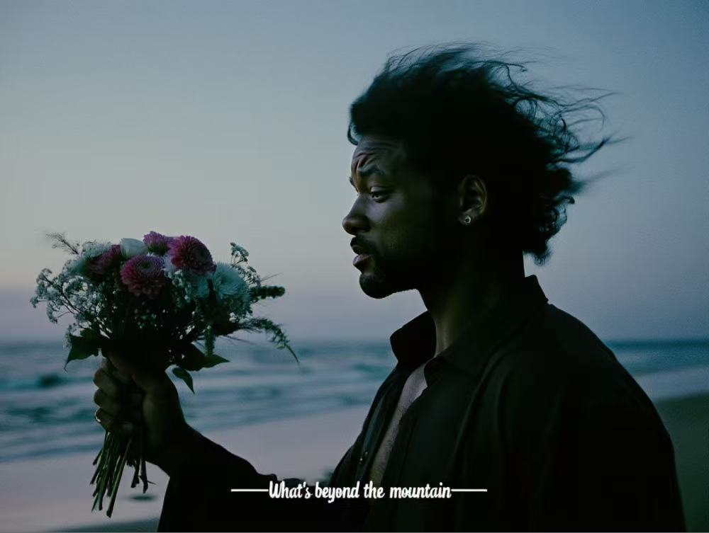 接着我又尝试把人物朝向调一下。原本是背影,我希望换成正脸面对镜头的视角,于是改了提示词:“威尔史密斯正脸面对镜头,手持一束花束,侧身站立于海边……”修改后,系统自动把它翻译成英文并重新理解,背景里的“沙滩”元素也跟着变了。